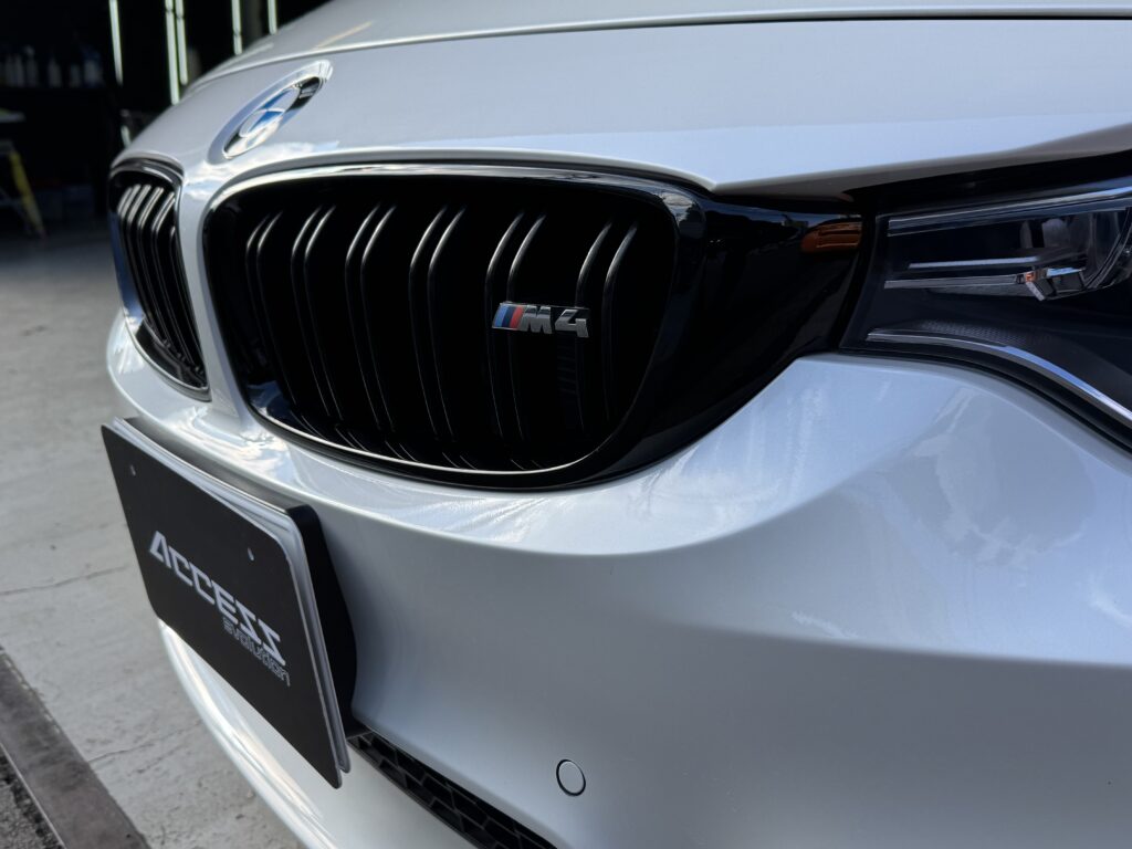 キドニーグリルをメッキからブラックに、M4バッジは残したいとのご相談だったので、